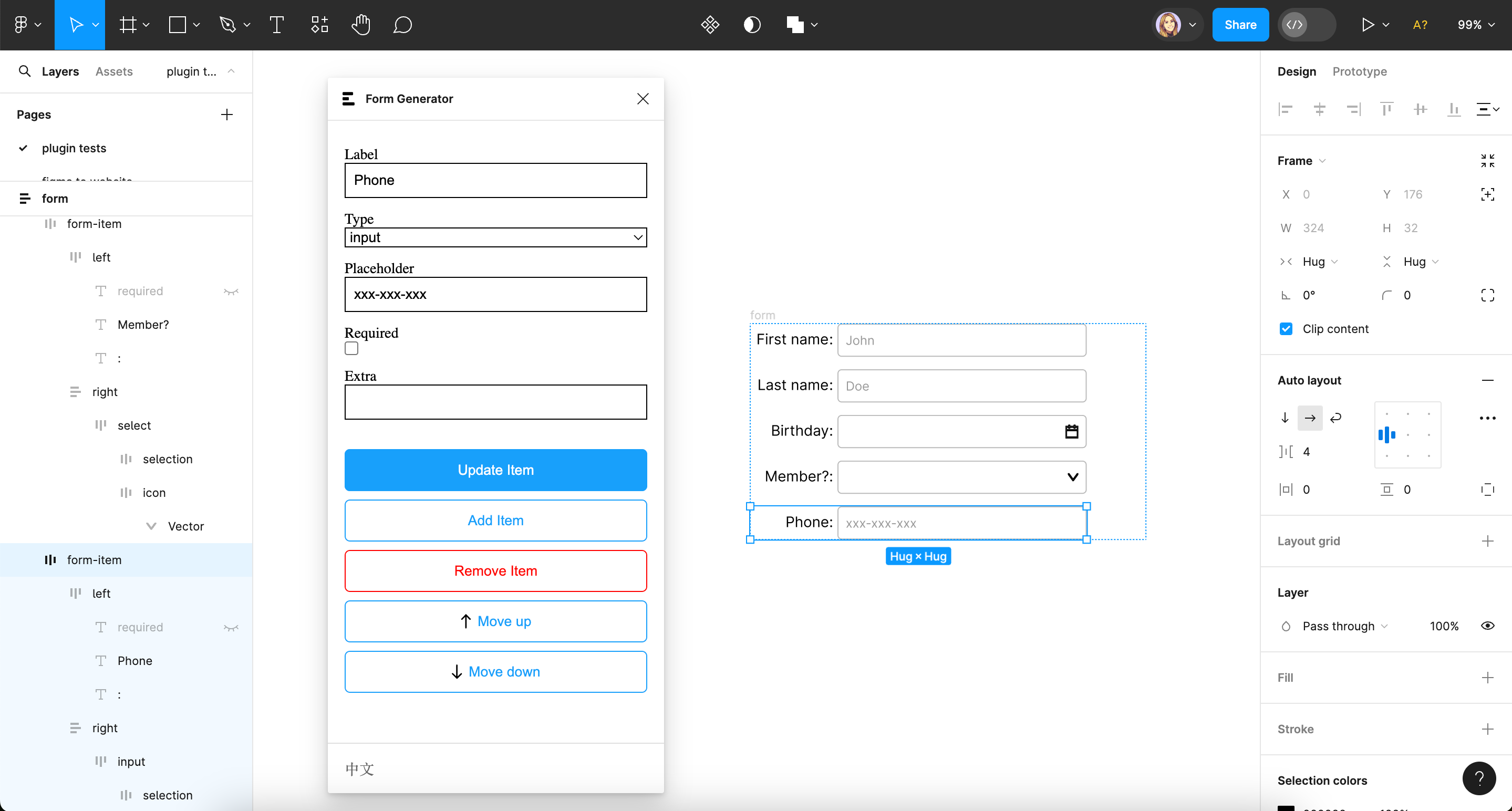 Form Generator is a straightforward plugin for building forms. The UX is a little tricky to figure out at first, as you have to click “Update item” after filling in your preferences in order to see the results on your canvas. But for a free plugin, it’s a nice time-saver when it comes to designing standard forms.