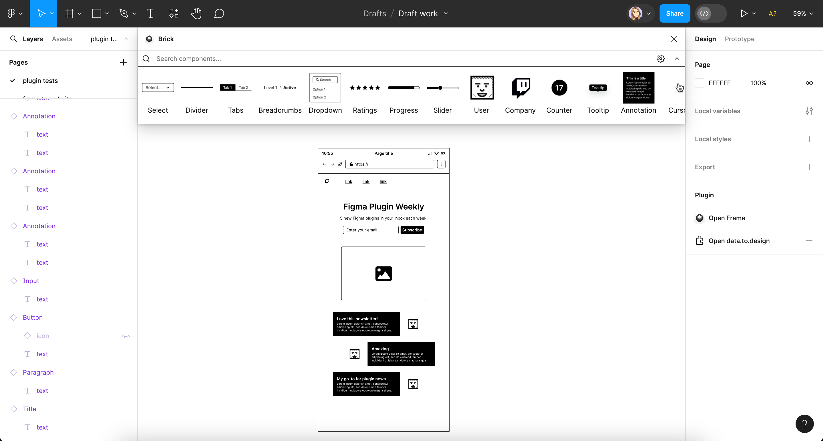 Brick on the other hand is a plugin for the beginning stages of the design process. It adds a top panel to your Figma canvas from where you can drag and drop components to create wireframes. The top panel is a nice format, as it doesn’t clutter the canvas while you’re designing, although the components available are still somewhat limited.
