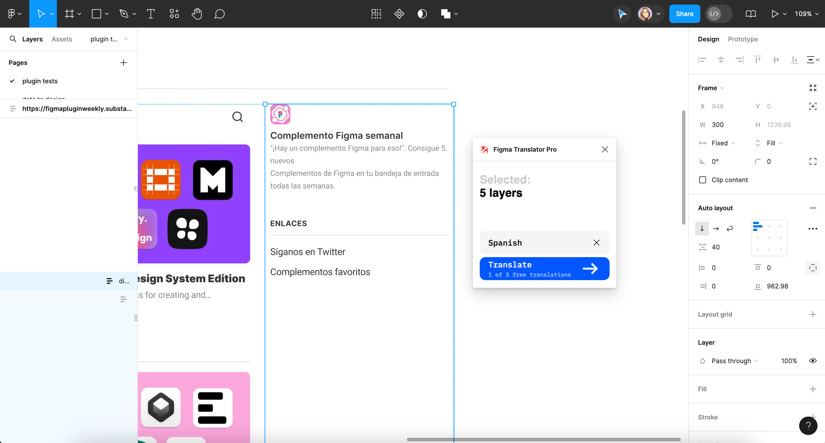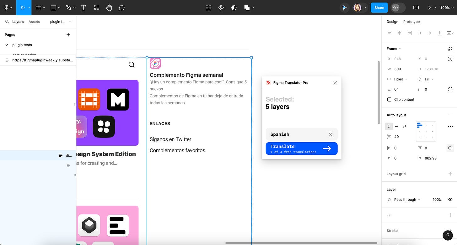 Figma Translator Pro is another text plugin that instantly translates any selected text on your canvas into one of the 130 languages available. Simply select all text layers you want to translate, select your target language from the drop-down list in the plugin and hit ‘Translate’. Your selected text layers will be automatically updated with the equivalent translations. Figma Translator Pro comes with 3 free translation runs to try it out.