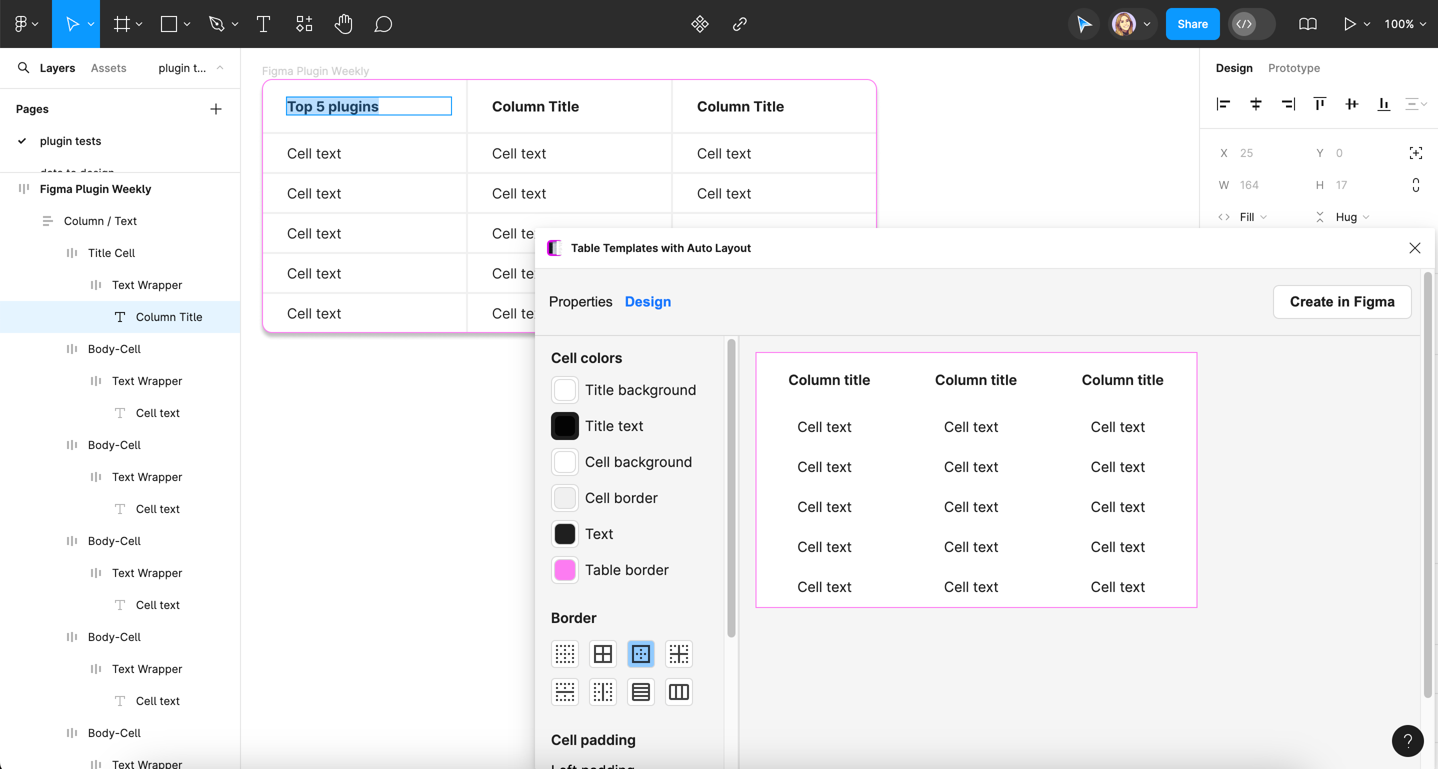 Table Templates with Auto Layout generates fully customizable and editable tables directly in your Figma canvas. While there are already several table-generating plugins, there’s something that sets this one apart: auto layout. Each table created by the plugin comes with auto layout perfectly set up for you, which makes resizing and editing a breeze.