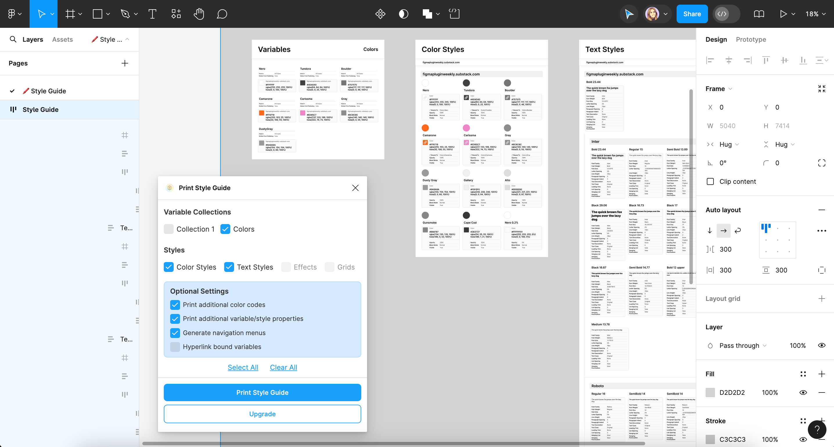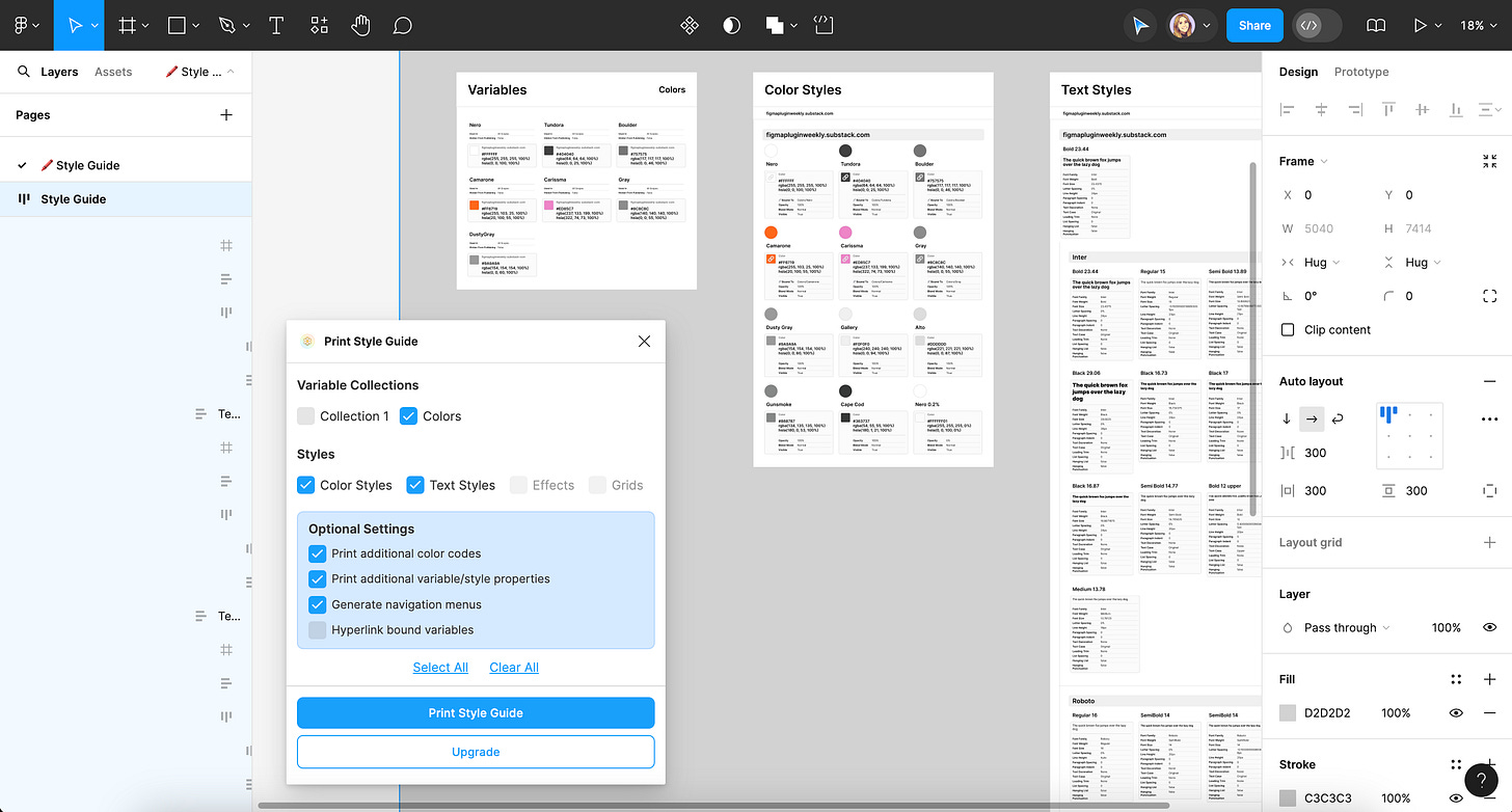 Print Style Guide takes all your variables, styles and components to lay them out in a separate page as a fully-documented style guide. It’s perfect if you need documentation for your design system, or a printable style guide for your marketing team. Most features are entirely free, and a few are only available with a subscription.