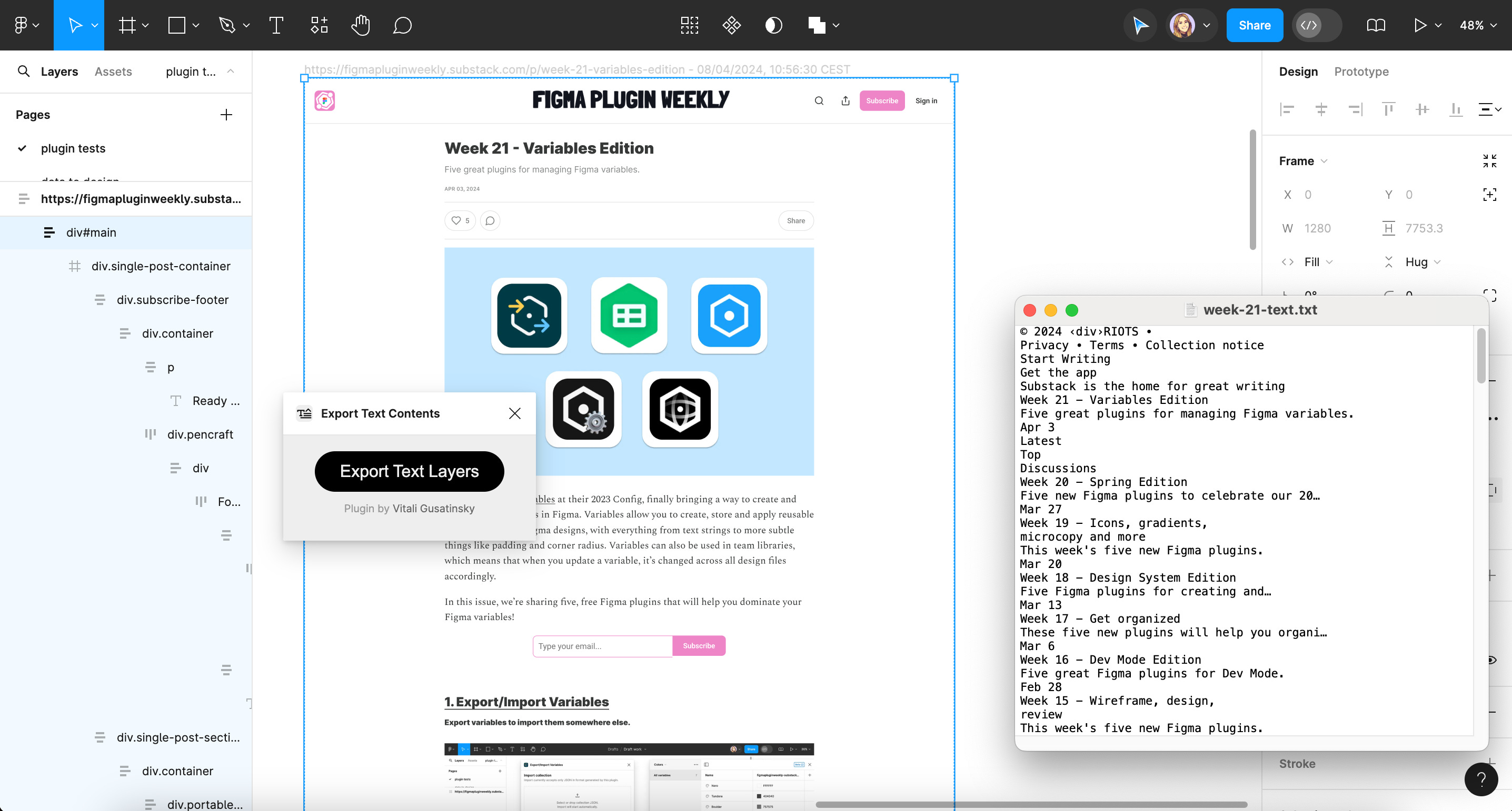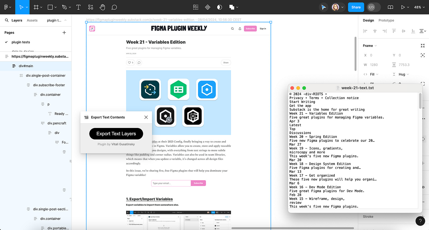 Export Text Contents is an incredibly simple Figma plugin with a single button that performs a single action. It takes all text layers in the given Figma canvas and exports it as a .txt file, directly saved in your Downloads. This is great if you’ve been designing something in Figma, but then need the text for something else, saving a lot of back and forth, copying and pasting.