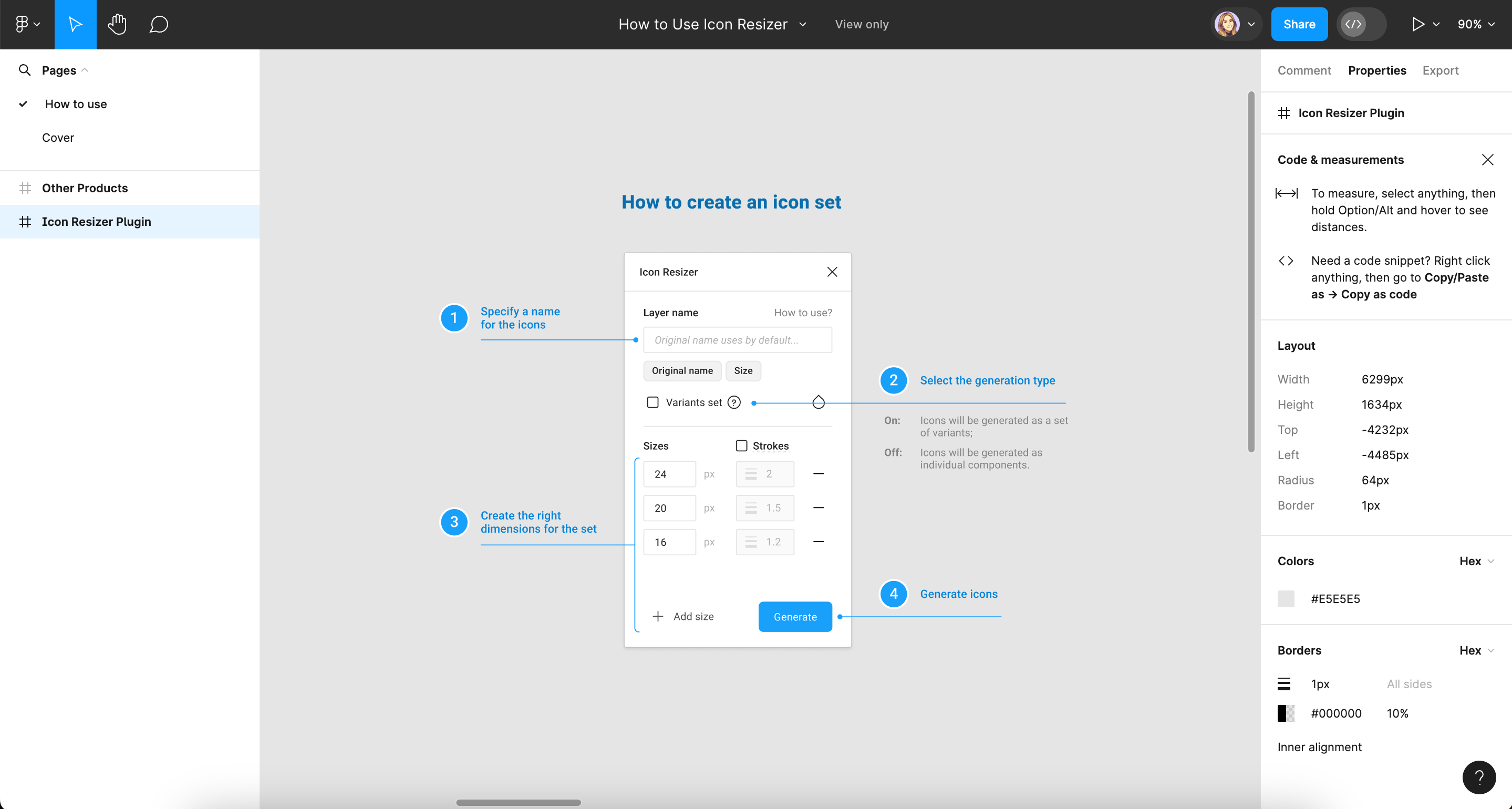 Icon Resizer takes any icon and resizes it to create variants for a complete icon set. You can quickly add or remove icon dimensions, generate both individual icons and a grid of variants, set stroke thickness to frame the size of the icon if it uses outlines and quickly rename icon components using variables. Plus, you have a root icon component that allows you to make changes in a single place to edit the entire set automatically.