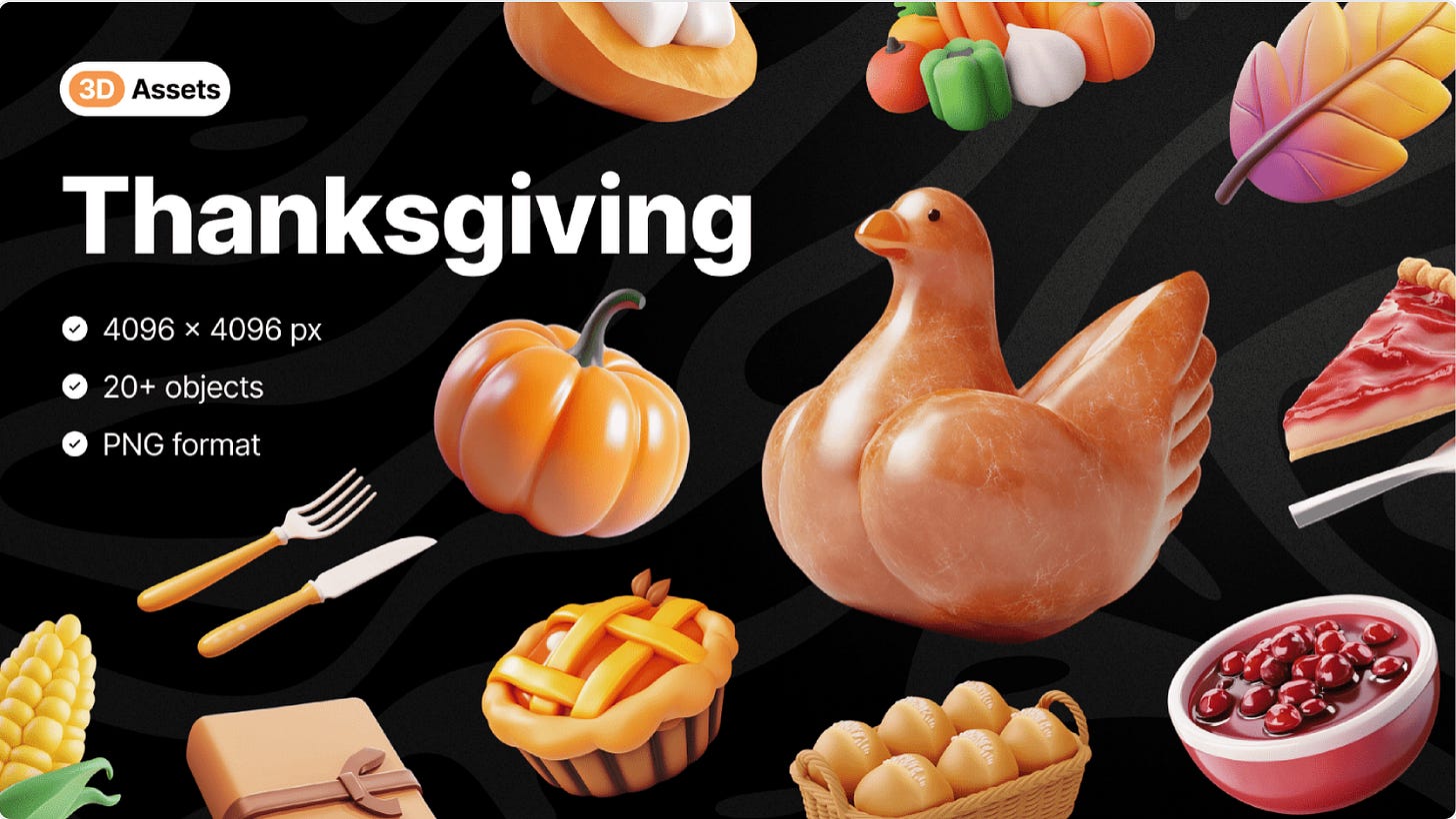 Over 20 assets in 3D, inspired by Thanksgiving.