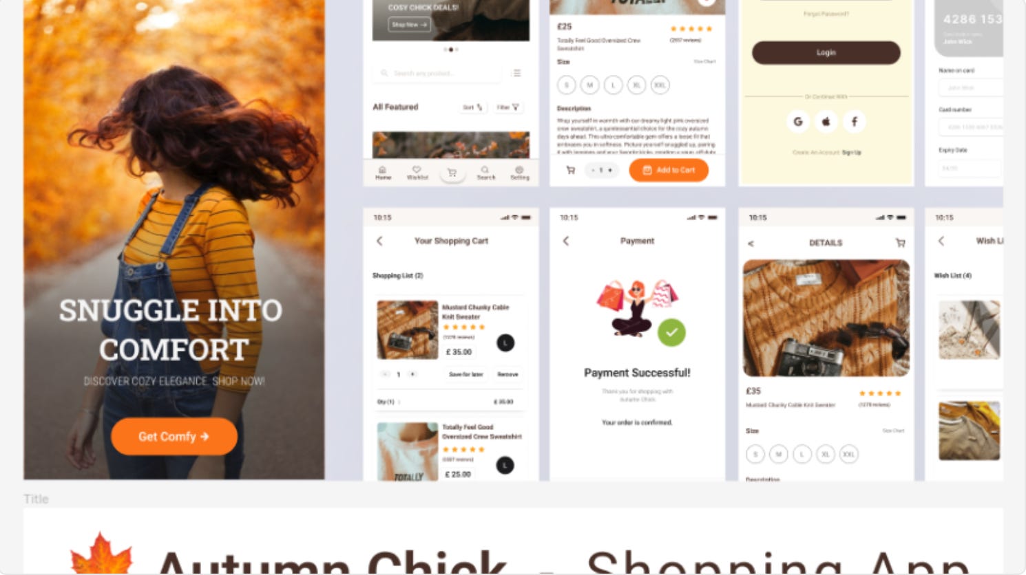 If your portfolio needs a seasonal refresh, this Autumn Chick Shopping App UI kit is a great place to start. The prototype keeps things simple, clean, and stylish — letting you showcase cozy sweaters, scarves, and other fall fashion essentials in a mobile-friendly layout.