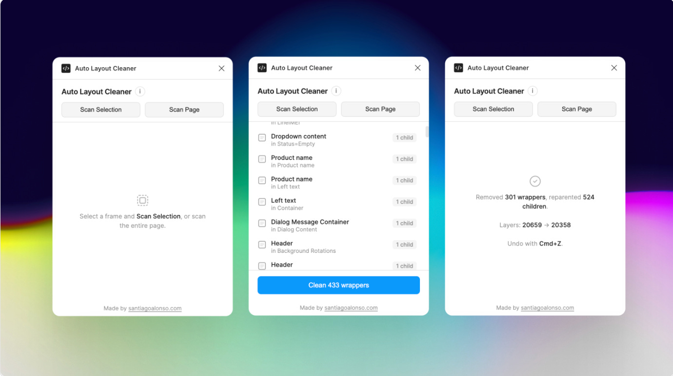 Most of the plugins this week are laser-focused on cleaning up the mess that accumulates as you design — redundant wrapper frames, hardcoded values floating outside your design system, components with inconsistent naming, frames still called “Frame 4823”. We have a realtime frame renamer, an auto layout cleaner, a design system auditor and a props tidier… And the odd one out may not clean anything up, but will come in handy if you’re migrating files.