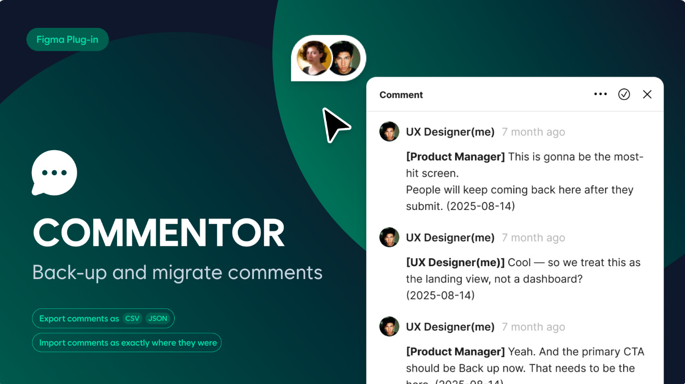 Commentor exports Figma comments as CSV or JSON and then imports them exactly where they were, preserving thread structure and anchor positions. It’s perfect when splitting files, rebuilding screens, or migrating design systems. Author and date context is also embedded in imported messages for a clearer review history.