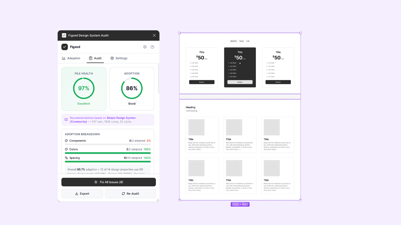 Figxed Design System Audit checks your Figma files to detect hardcoded values that are not bound to your design system tokens, measuring overall design system adoption. It also comes with the option for a one-click auto-fix to bind the correct variable to any property, as well as a batch “Fix All” to resolve multiple issues at once. The plugin also offers a birds-eye view of your design system adoption with a visual health score (0-100%) and tracking of design system vs. local vs. detached components.
