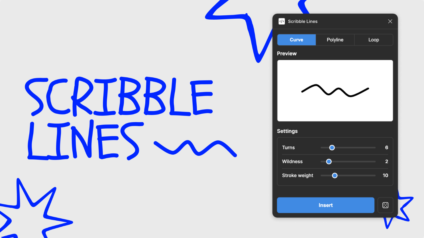 Scribble Lines Generator allows you to create curve, polyline, or loop lines with a handwritten scribble effect. Control the number of bends in the line, how dramatic the amplitude, spacing, and noise are and the thickness of the line. Then click to insert to add your scribble to the canvas. Each scribble is a single vector path that is fully editable with Figma’s vector tools.