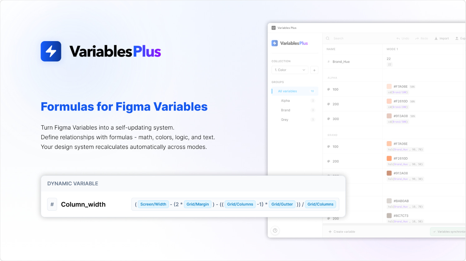 Static variables aren’t scalable. The minute you change a base value, you need to recalculate spacing scales, typography ratios… Variables Plus lets you write formulas between Figma Variables so your design system updates itself automatically. The plugin allows you to create computed variables using math (e.g. spacing-lg = spacing-base * 2), reference variables inside other variables, keep values aligned across modes and drive entire systems from one base token. Download the demo file to test it out!