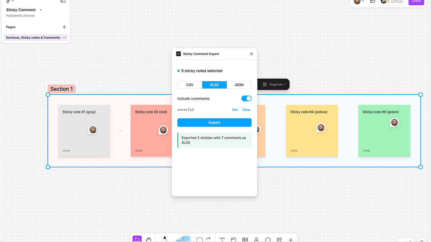 Sticky Comment exports your FigJam sticky notes into structured, ready-to-use files (with threaded comments included) as clean CSV, XLSX, or JSON files in seconds. Each sticky is exported including text content and author, color label, section hierarchy (including nested sections) and the canvas position (X/Y coordinates). If you toggle on comment fetching, stickies are matched with any Figma comments pinned to them — including full threads, authors, timestamps, and resolved status. Perfect for anyone who needs to take FigJam data into spreadsheets, reports, or other tools.