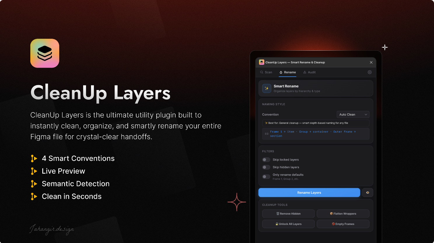If a little spring cleaning is in order, try the new CleanUp Layers plugin. Its “One-Click File Scanner & Health Score” analyzes your selected frame or entire page to give you a birds-eye view of your file's "health score", with detailed metrics on total layers, hidden layers, locked elements, and default frame names. You can then automatically rename layers with 4 different naming conventions, or try one of the plugin’s one-click cleanup tools: delete hidden layers, unlock all layers, remove empty frames.
