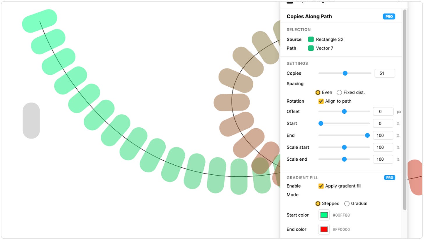 Copies Along Path is the easy way to align a shape and as many copies of that shape along a path. There’s no need to fiddle and adjust to achieve this manually. You can now pick your source shape and path and the plugin takes care of the rest.