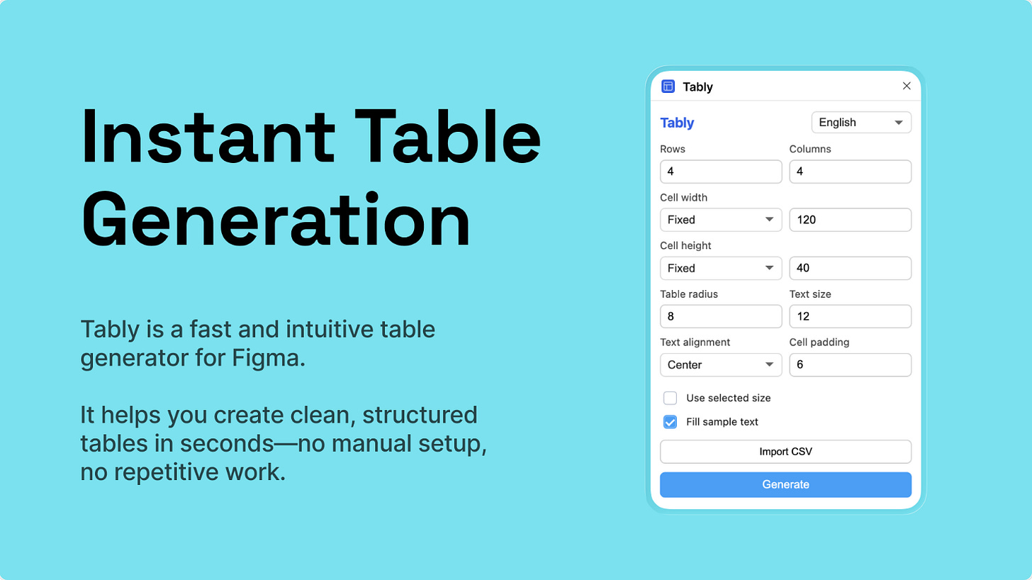 Tably helps you quickly generate tables, import CSV data, and create structured layouts with auto layout. Perfect for dashboards, data tables, SaaS products, and admin UI design. You can either generate a table with custom rows and columns, or import your CSV for an instant table with your own data.