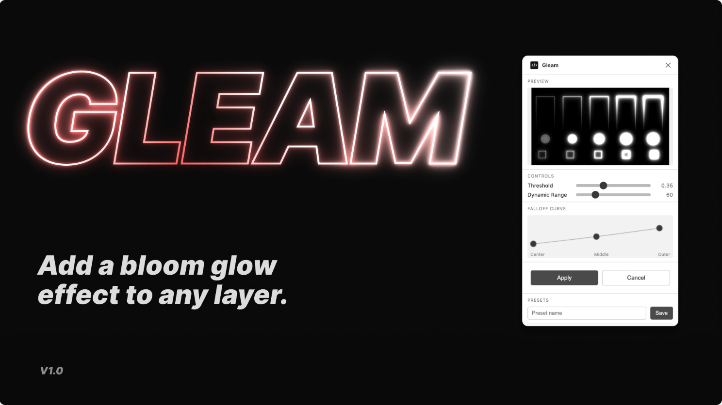 Gleam creates a cool glowing effect for any object in Figma, by adding a non-destructive transparent .png above your original layer. The plugin comes with easy-to-use controls to customize your glow effect, plus a live preview so you can see how it looks while editing. You can also save presets of your favorite glow effects to quickly apply to other layers.
