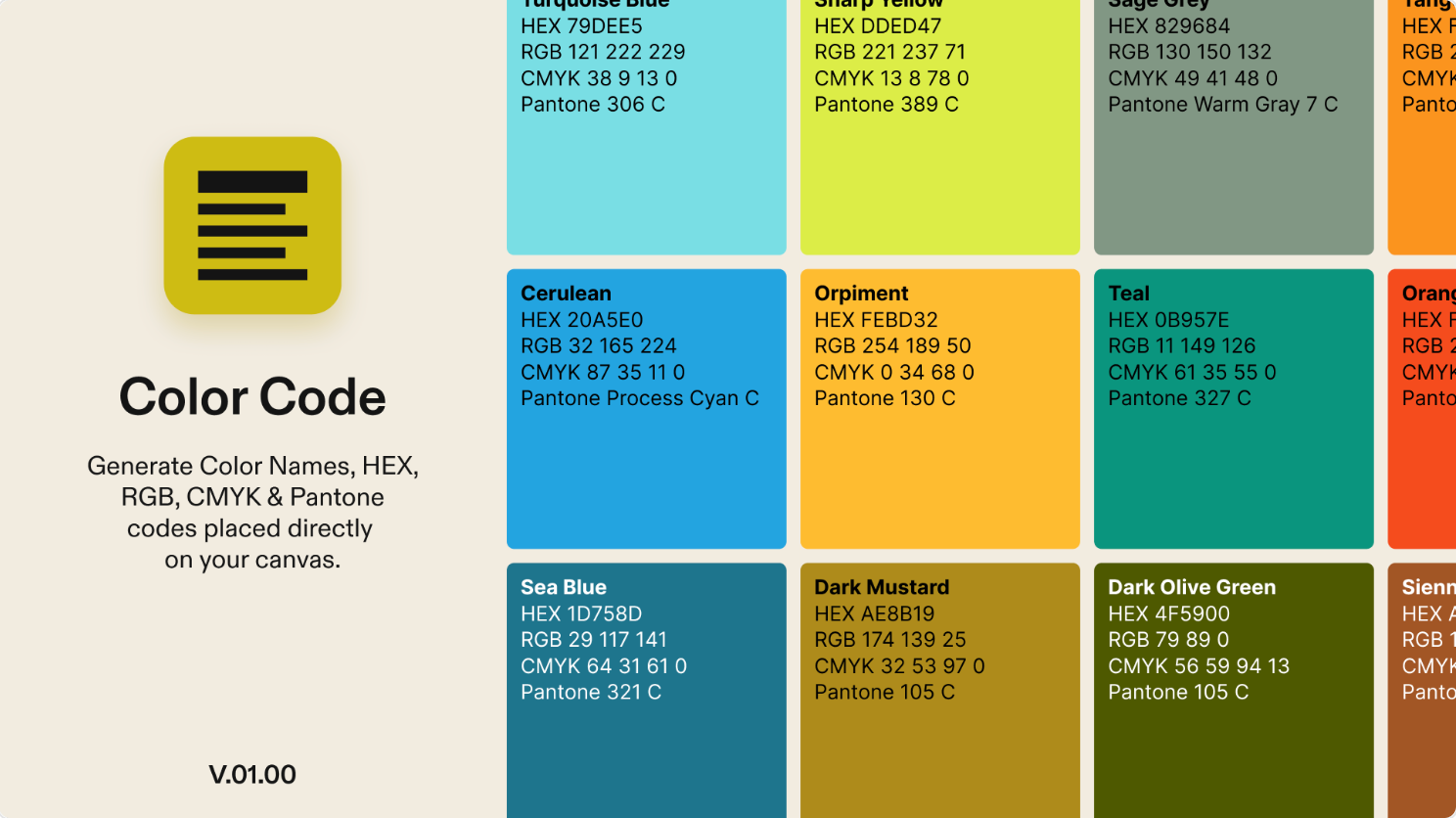 Color Code Generator creates formatted color annotations directly on your canvas. Simply select an object or an entire palette and get instant results. Perfect for brand guidelines and design documentation. The plugin can generate color name, HEX code, RGB code, CMYK or Pantone®. It works on a single object or an entire palette at once and does grid naming and auto-labels for whole palettes. You can customize font size and padding and toggle any code on or off at any time.