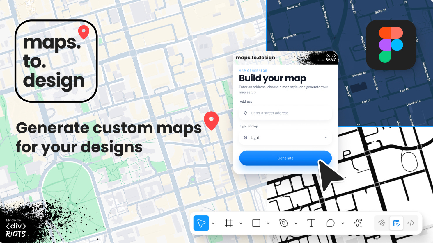maps.to.design is a fast and easy way to import real maps into Figma. Enter any location—cities, neighborhoods, custom routes—and the plugin places a realistic map in your Figma designs in seconds. You can customize the address, map type (including roadmap, 3D, light and dark), zoom level, whether to show a marker and whether to show the address.